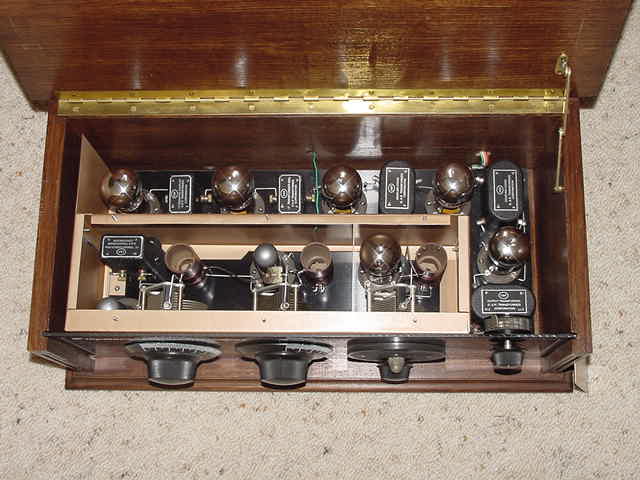 The valve lineup: neutralised RF amp., 1st detector, local osc., 1st IF amp., 2nd IF amp., 2nd detector, 1st audio amp and output stage.